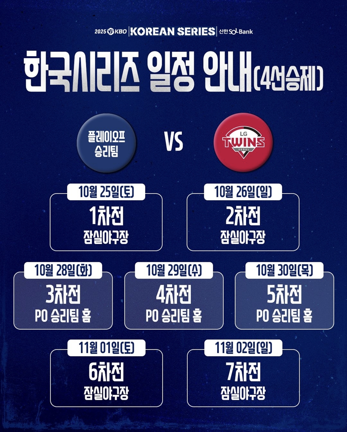 - 4차전: 10월 29일(수) 플레이오프 승리팀 홈