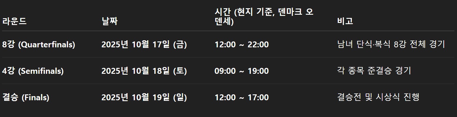 2025 세계배드민턴연맹(BWF) 덴마크오픈이 본격적인 토너먼트 막바지에 접어들었습니다. 한국의 안세영 선수는 여자 단식 8강에 진출하며 시즌 8번째 우승을 향한 도전을 이어가고 있습니다. 이번 글에서는 팬들이 가장 궁금해하는 덴마크오픈 8강, 4강, 결승 일정을 현지 기준과 한국 시간으로 나눠 정리하고, 실시간 중계 시청 방법까지 함께 안내합니다.