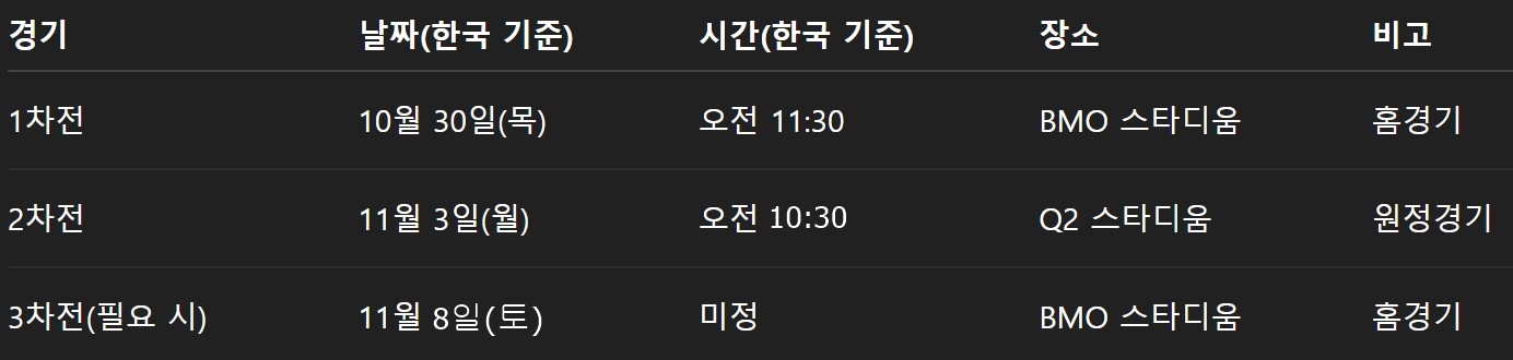 특히 1차전은 한국 시각으로 10월 30일 오전 11시 30분, 2차전은 11월 3일 오전 10시 30분에 열리므로 MLS 팬이라면 출근 전 짧은 아침 시간에 경기를 즐길 수 있습니다.