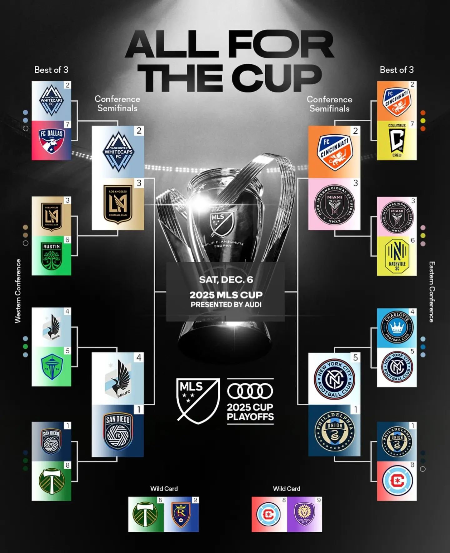 2025 MLS 플레이오프는 콘퍼런스별 7개 팀이 본선에 직행하며, 8위와 9위는 와일드카드를 통해 진출권을 다투게 됩니다.