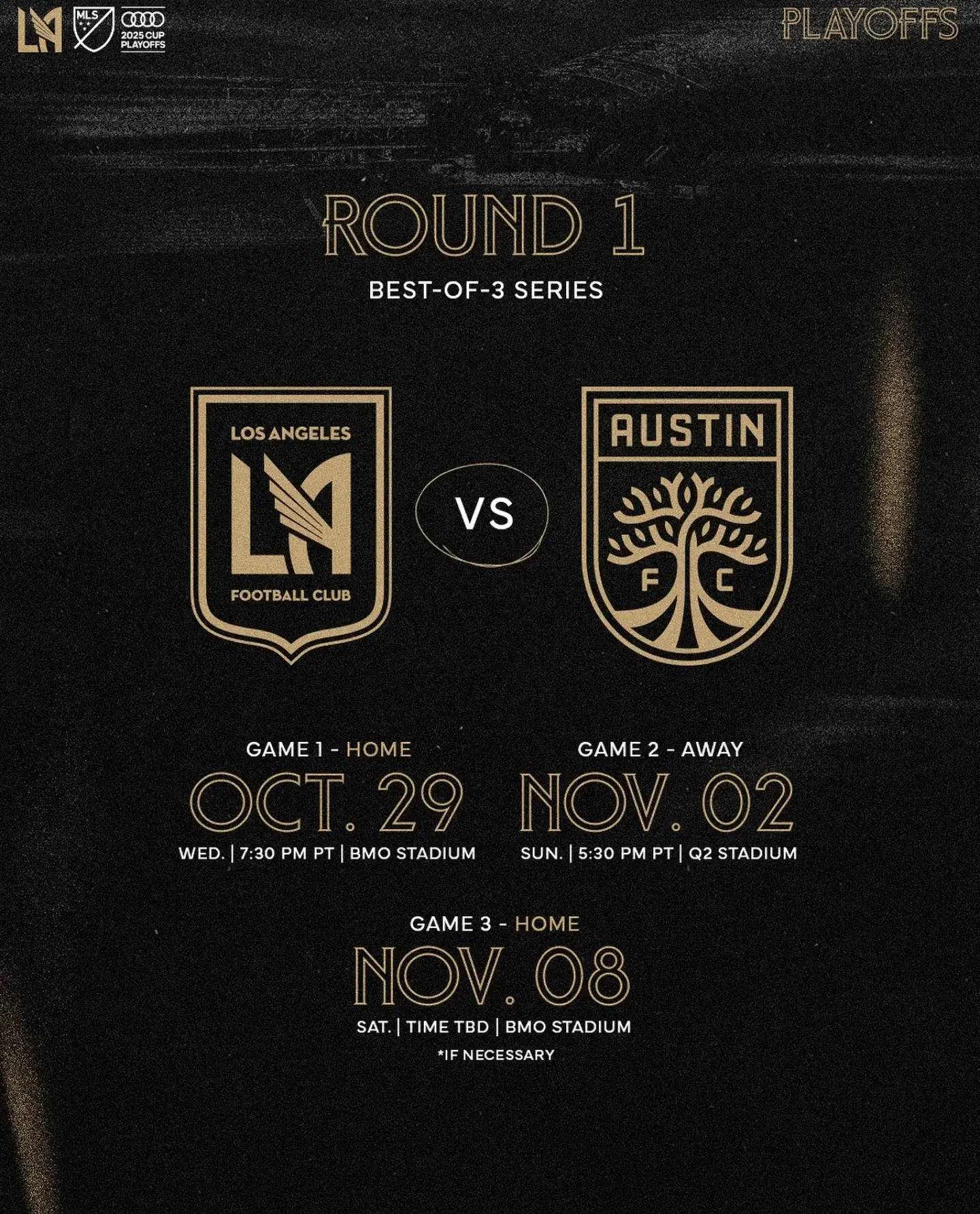 LAFC 플레이오프 일정은 3전 2선승제 방식으로 진행되며, 상대는 정규시즌 6위 오스틴 FC입니다. 1경기와 3경기(필요시)는 홈구장 BMO 스타디움에서 열립니다.